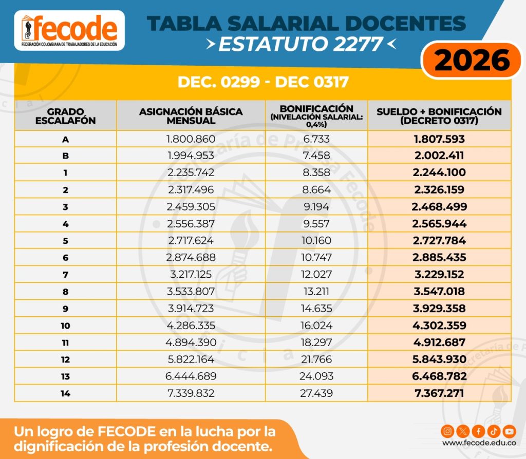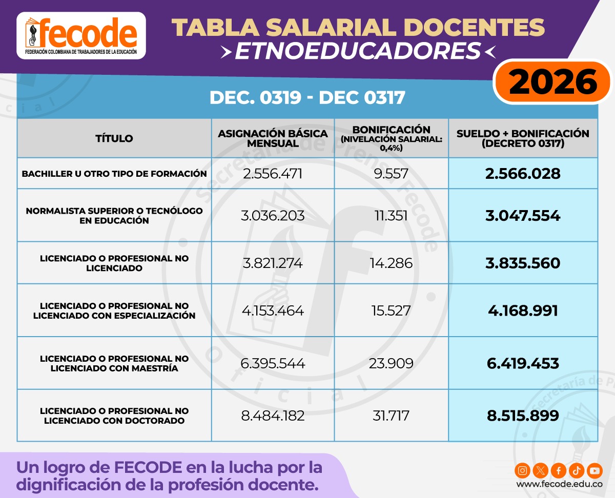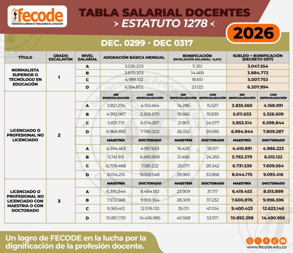 FECODE informa que, producto de la presión y gestión de la Federación y la lucha sindical, el Gobierno Nacional expidió hoy 25 de marzo los decretos que establecen el incremento salarial para el Magisterio Colombiano: